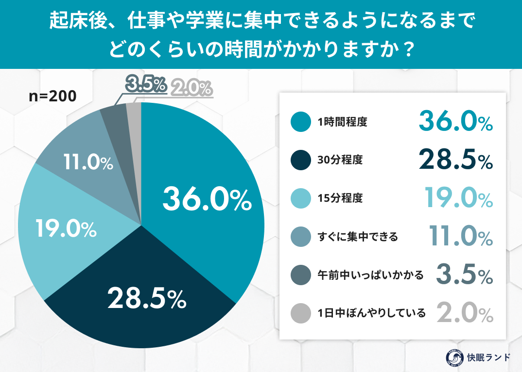 起床後、仕事に集中できるようになるまでの時間を尋ねると、「1時間程度」が36.0%で最多。「午前中いっぱいかかる」が3.5%、「1日中ぼんやりしている」が2.0%と、「すぐに集中できる」の11.0%を大きく上回った。