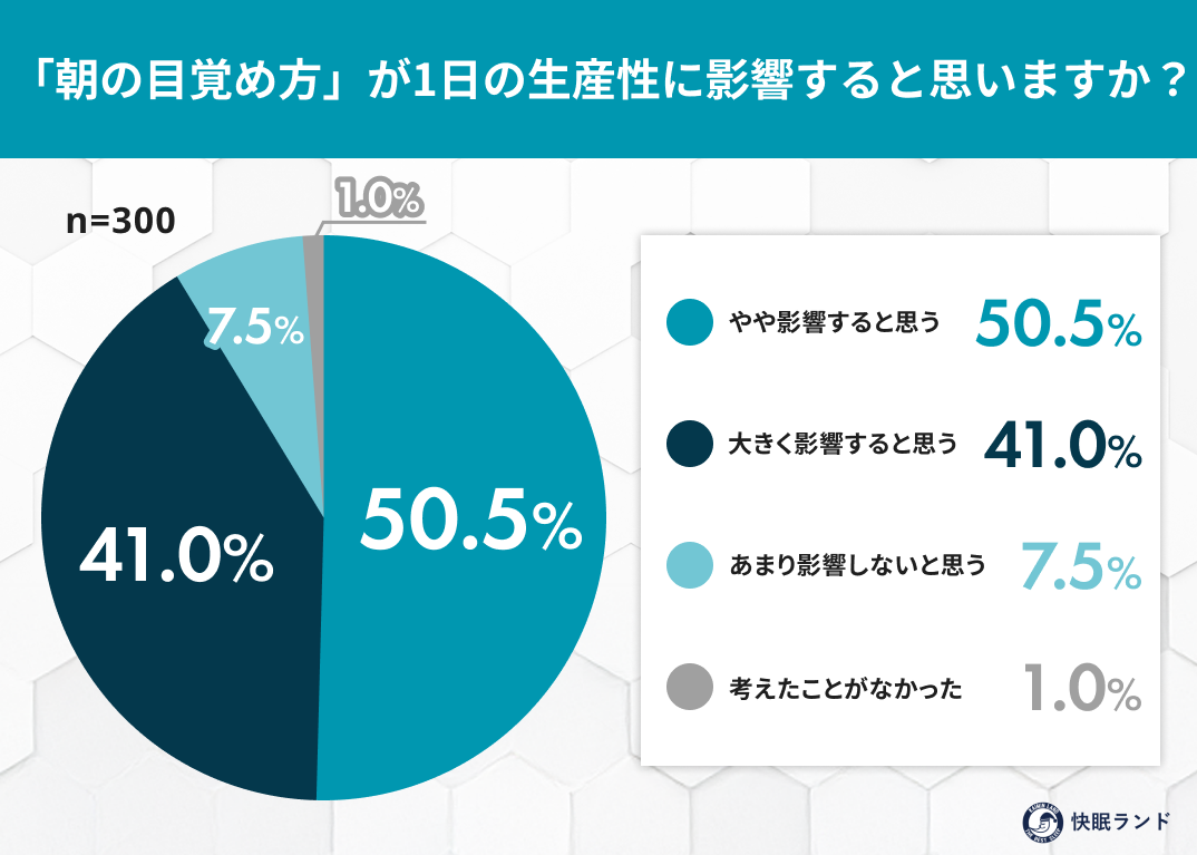一方で91.5%が「朝の目覚め方が1日の生産性に影響する」と認めている。影響を自覚しながら半数がアラーム起床を続けているのは、起き方を変えるという発想自体が選択肢として意識されていないからではないか。睡眠の「質」には関心が向いても、「覚醒の質」に目を向ける人はまだ少ない。