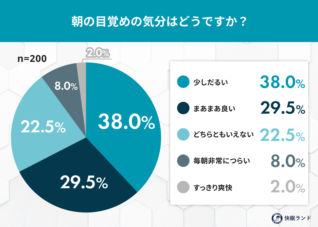 問題は目覚めた直後の体感だ。「少しだるい」が38.0%で最多、「毎朝非常につらい」も8.0%にのぼり、「すっきり爽快」はわずか2.0%にとどまった。