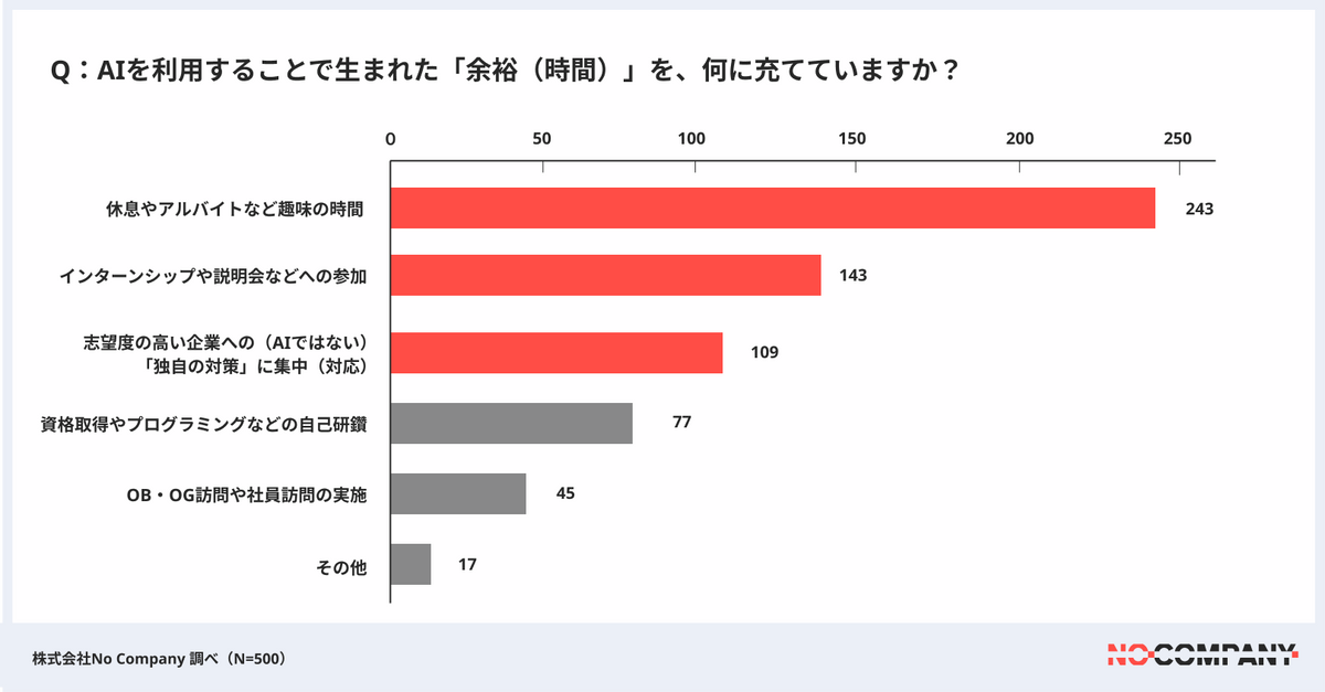 ただし、AIに任せきりというわけではない。AI活用で生まれた時間の使い道を見ると、インターンシップや説明会への参加に充て、OB・OG訪問に動いた学生もいた。