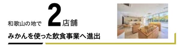 ブレイクスルーポイント|柑橘加工品の製造販売という従来事業から、みかんを使った飲食事業へと領域を大きく拡大した。和歌山の地で2店舗を新規オープンし、「食べる・買う・体験する」を一体化した顧客接点を構築。地域の魅力発信拠点として観光需要も取り込みながら、ブランド価値と売上の両方を高めることに成功している。