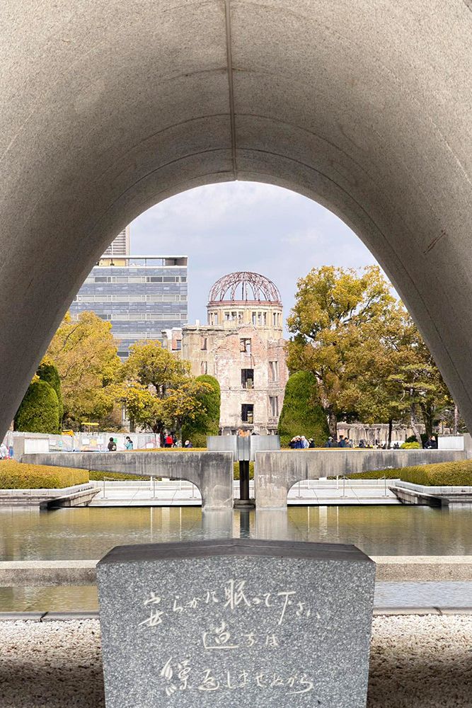 丹下健三が設計した軸線——原爆ドームから慰霊碑を貫き、平和記念資料館へと至る一本の線。これは本来、極めて記念碑的であり、歩く者の視線と身体を強く統御するモダニズムの徹底したコントロールである。慰霊碑のアーチの向こうにドームが収まるよう周到に計算されたその空間で、私たちは過去と現在が同時に視界に入る自らの位置を、否応なく意識させられる。