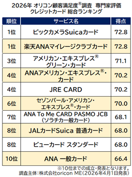 こうした中、オリコン株式会社および株式会社oricon MEが、金融のプロフェッショナルが厳選した「2026年 オリコン顧客満足度調査 専門家評価 個人向けクレジットカードランキング」を発表している。