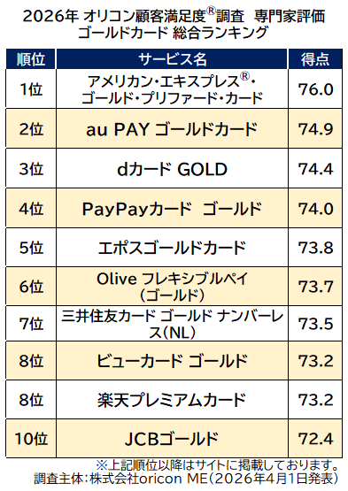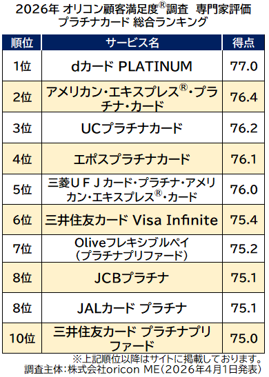 出典:オリコン株式会社「2026年 オリコン顧客満足度調査 専門家評価 クレジットカードランキング」より