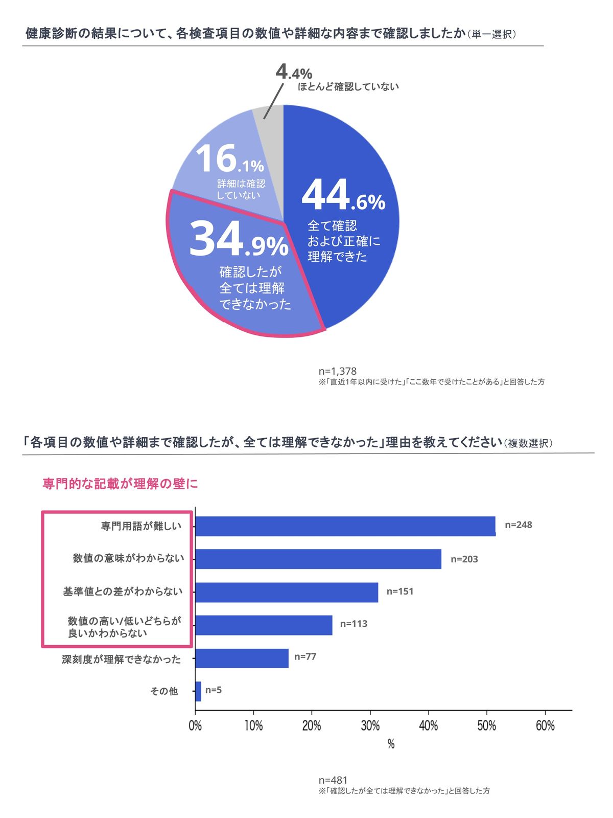 この受診を阻む障壁を詳細に分析すると、従来の「多忙だから」という理由以上に、結果そのものに対する「理解不足」が大きく影響していることが見て取れる。健診結果を確認しても、全体の約35%が「内容を理解できなかった」と回答しており、その主な要因として「数値が示す意味がわからない(51.6%)」や「専門用語が難しい(42.2%)」が挙げられている。医学的な専門表現が、一般の生活者にとっての大きな「理解の壁」となり、結果の深刻さを正しく認識することを妨げているようだ。