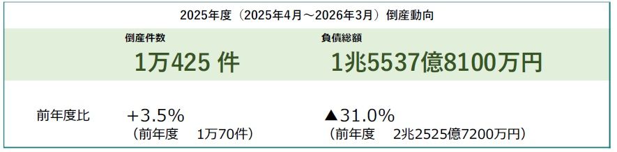 現在の国内経済は、緩やかな回復基調にある一方で、原材料価格の上昇や人件費の高騰といったコストプッシュ型の圧力に晒されている。こうした経営環境の変化を背景に、帝国データバンクが発表した2025年度(2025年4月〜2026年3月)の全国企業倒産件数は、前年度比3.5%増の1万425件に達した。