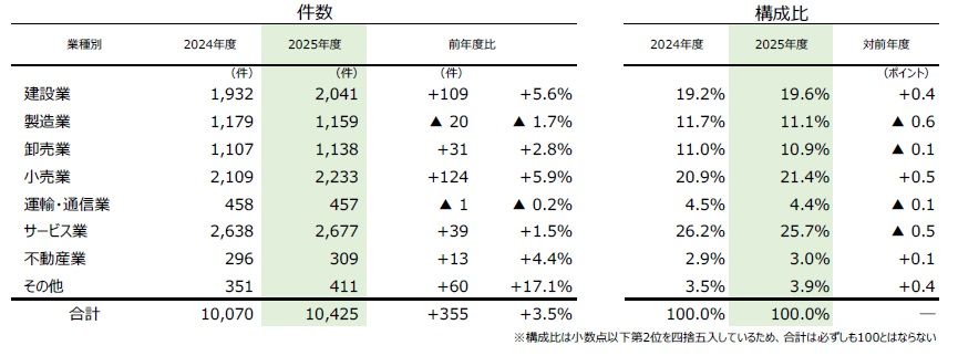 業種別の動向を見ると、全7業種のうち5業種で前年度を上回る結果となった。なかでもサービス業が2677件(前年度比1.5%増)、小売業が2233件(同5.9%増)を記録し、いずれも2000年度以降で最多を更新。サービス業では医療スタッフの確保難に直面する医療分野、小売業では物価高や人件費負担が重くのしかかる飲食店において、倒産が増加している。また、建設業も2041件と過去10年で最多を記録しており、資材高騰と人手不足のダブルパンチが業界全体を直撃している実態が浮き彫りとなった。