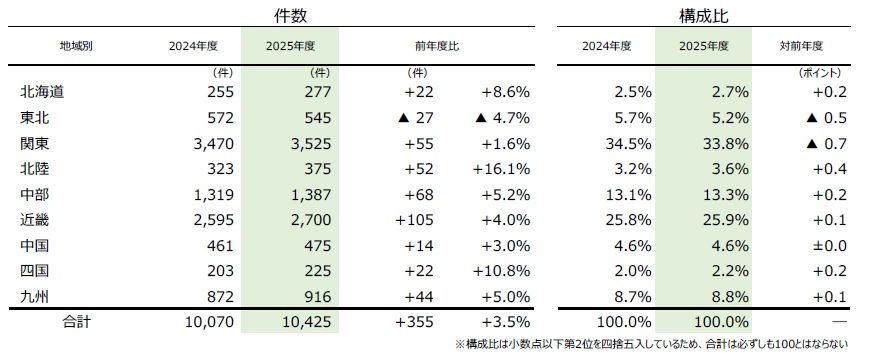 地域別では、東北を除く8地域において過去10年で最多を記録。特に関東は3525件と全体の33.8%を占め、4年連続で前年度を上回る結果となった。