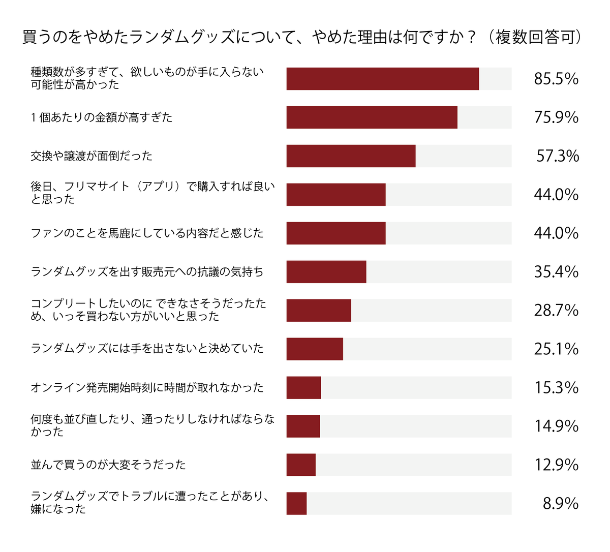 実際に、93.6%のファンが「ランダム販売であったこと」を理由に購入を断念した経験を持っており、その主因は「種類数が多すぎて、欲しいものが手に入らない可能性が高かった」(85.5%)というものだった。