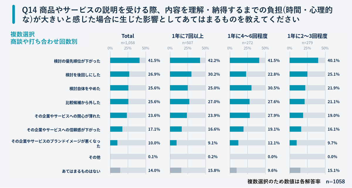 こうした負担は、その場の印象だけにとどまらない。説明の要点にたどり着くまでに時間がかかると、サービスや商品を前向きに検討しにくくなると答えた人は多く、実際に「検討を後回しにした」「比較対象から外した」といった行動も確認された。