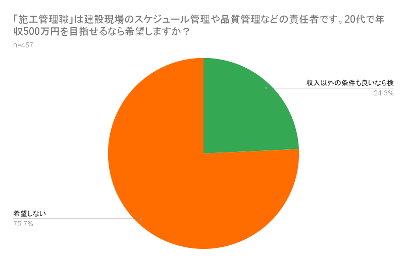 中でも注目は「施工管理職」が20代で年収500万円を目指せるという比較的好条件を提示しても、同職を「希望する」と答えたZ世代は0%という結果だったことだ。一方で「希望しない」との回答は75.7%に上り、給与アップという直接的なメリットだけでは覆せない、心理的な抵抗感の強さがうかがえる。