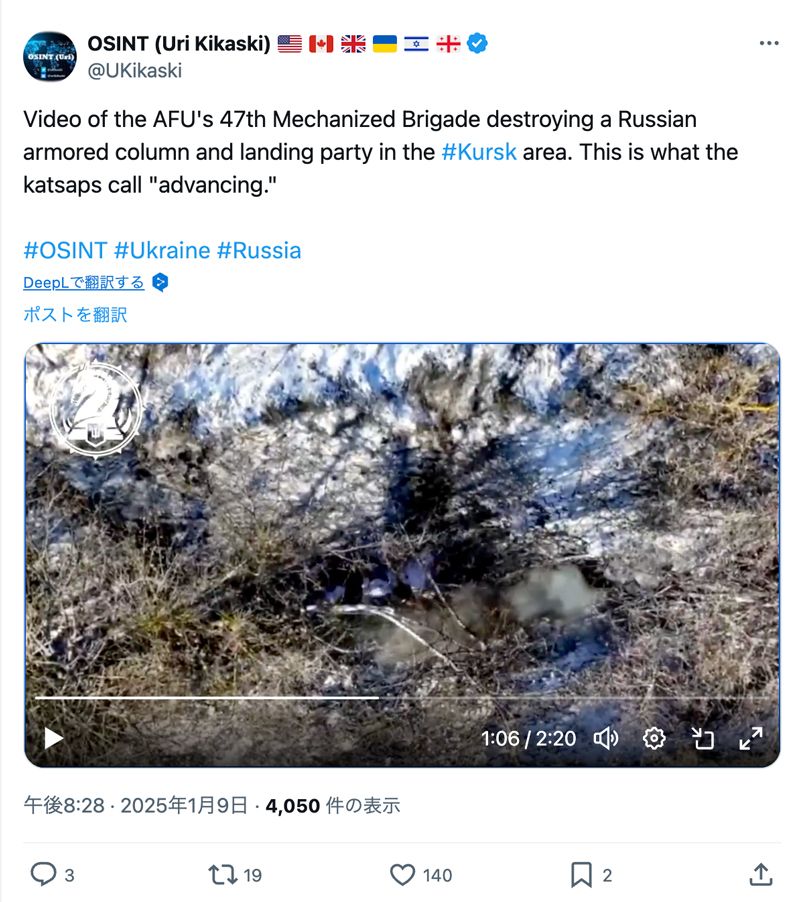 雪に覆われた平原を進むロシア軍の車列はたちまちウクライナ軍・第47機械化旅団と近傍の部隊のドローンやミサイル、大砲による攻撃を浴びることになった(Xのスクリーンショット)