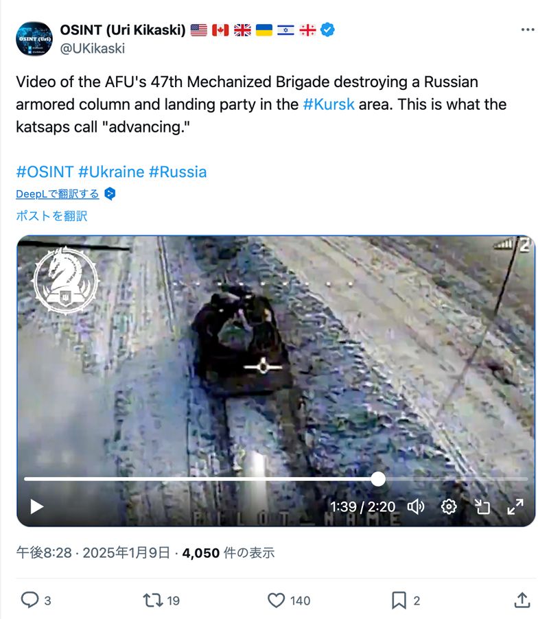 雪に覆われた平原を進むロシア軍の車列はたちまちウクライナ軍・第47機械化旅団と近傍の部隊のドローンやミサイル、大砲による攻撃を浴びることになった(Xのスクリーンショット)