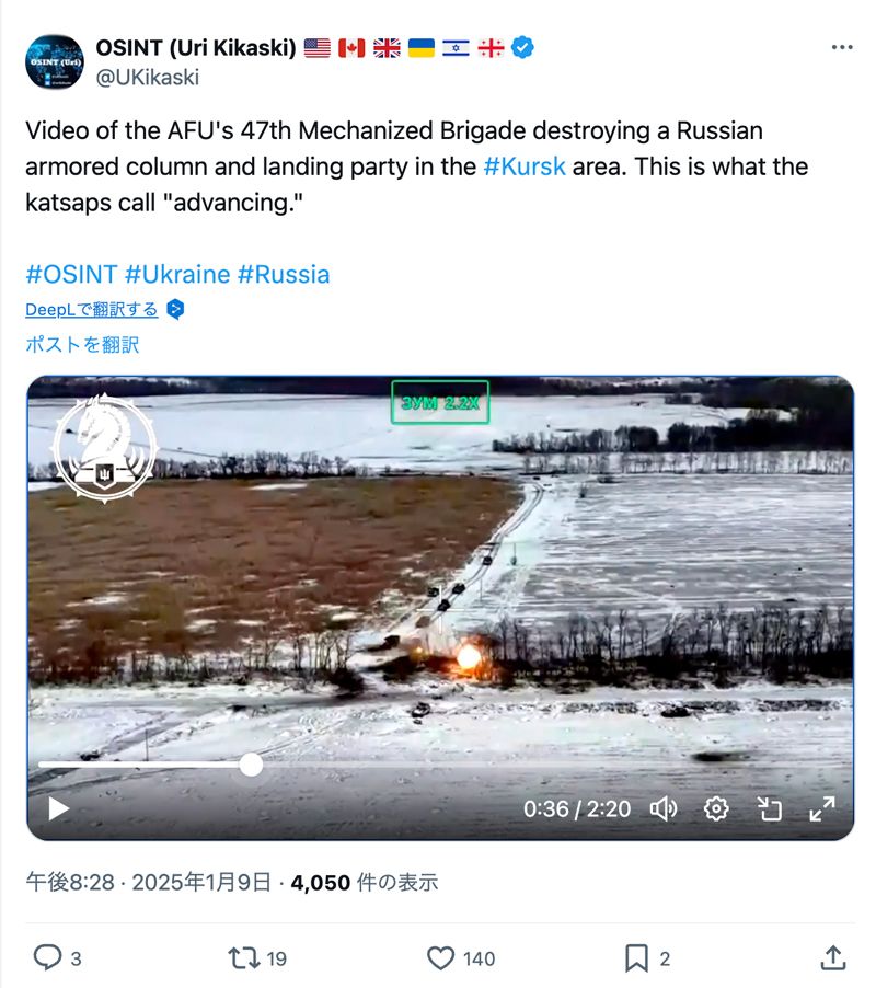 雪に覆われた平原を進むロシア軍の車列はたちまちウクライナ軍・第47機械化旅団と近傍の部隊のドローンやミサイル、大砲による攻撃を浴びることになった(Xのスクリーンショット)