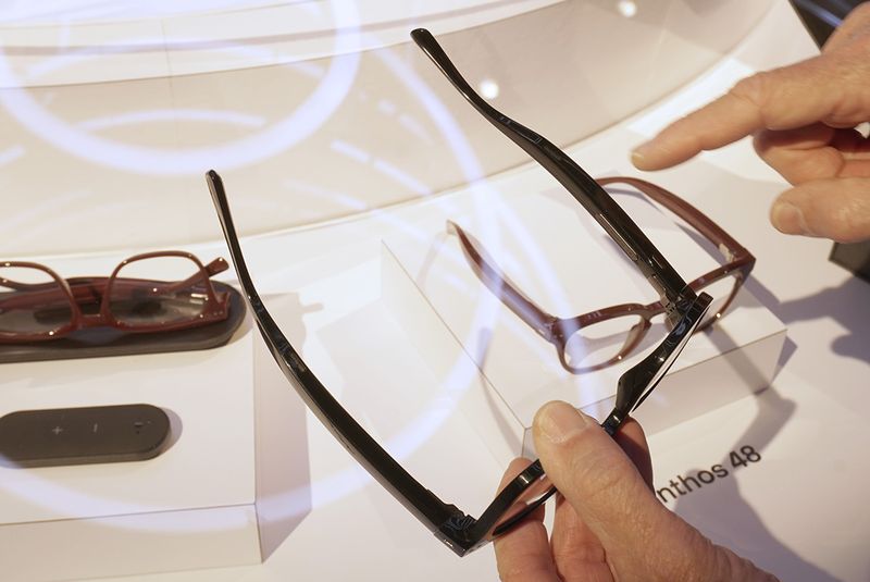 テンプルに下向きに搭載した小型スピーカーから、声や環境音をブーストして聞かせる