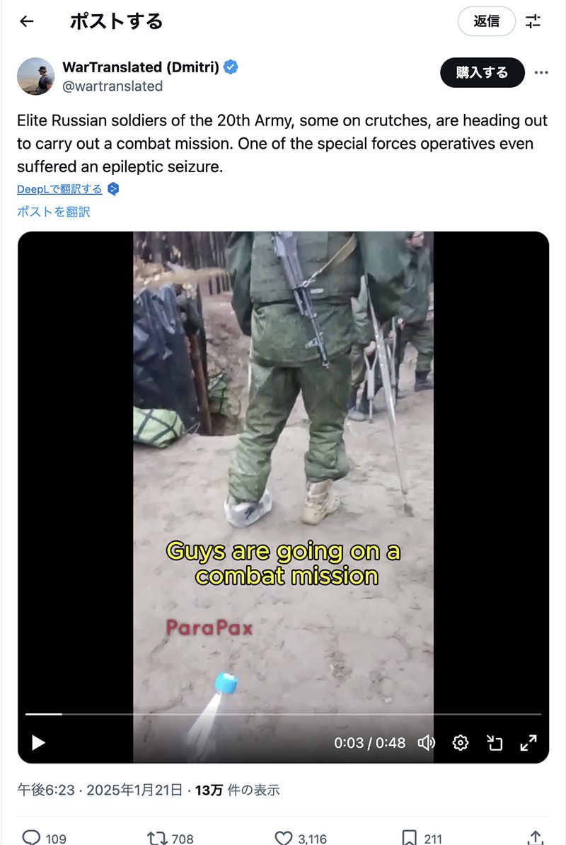 突撃のために集合する松葉づえをついたロシア兵たち(Xのスクリーンショット)