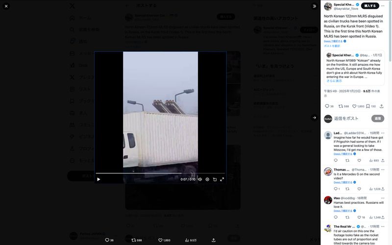 2023年に平壌で行われた軍事パレードで、朝鮮人民軍は箱型トラックやダンプトラックの荷台に多連装ロケット砲を収納した自走砲を披露していた(Xのスクリーンショット)