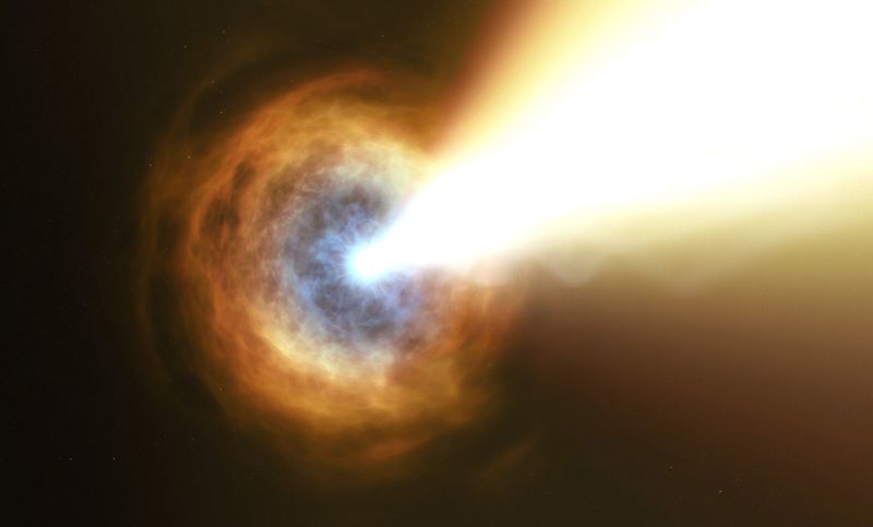 約50億光年の距離にある銀河の中心付近で発生したガンマ線バースト「GRB 190114C」を描いた想像図(ESA/Hubble, M. Kornmesser)