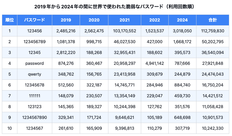 2019年から2024年の間に世界でしようされた脆弱なパスワード。利用回数順報告書から再構成)
