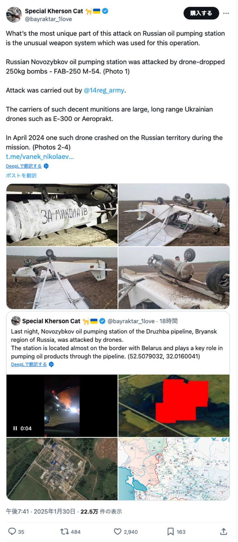ウクライナ軍はアエロプラクト社製A-22をはじめとする民生用の軽量スポーツ機を遠隔操作式に改造し、100kgの爆弾を胴体底部に装着可能なドローンを運用してきた(Xのスクリーンショット)