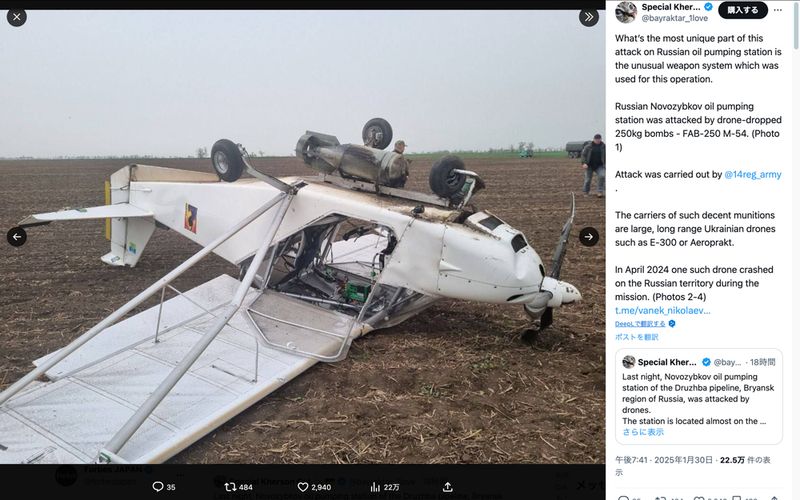 ウクライナ軍はアエロプラクト社製A-22をはじめとする民生用の軽量スポーツ機を遠隔操作式に改造し、100kgの爆弾を胴体底部に装着可能なドローンを運用してきた(Xのスクリーンショット)