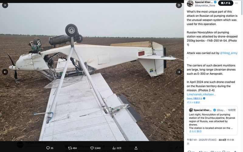 ウクライナ軍はアエロプラクト社製A-22をはじめとする民生用の軽量スポーツ機を遠隔操作式に改造し、100kgの爆弾を胴体底部に装着可能なドローンを運用してきた(Xのスクリーンショット)