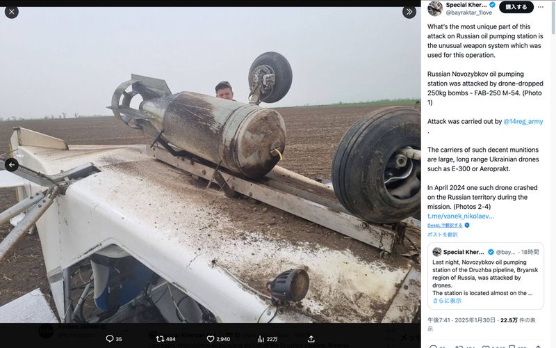 ウクライナ軍はアエロプラクト社製A-22をはじめとする民生用の軽量スポーツ機を遠隔操作式に改造し、100kgの爆弾を胴体底部に装着可能なドローンを運用してきた(Xのスクリーンショット)