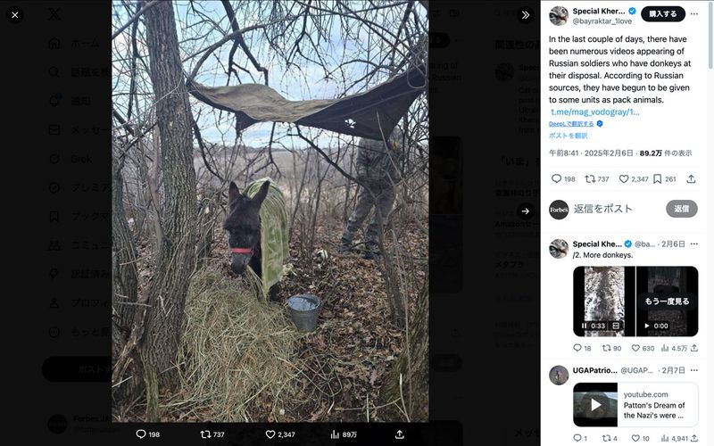ロシア軍が補給に活用するロバや馬(Xのスクリーンショット)