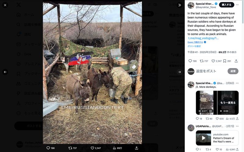 ロシア軍が補給に活用するロバや馬(Xのスクリーンショット)