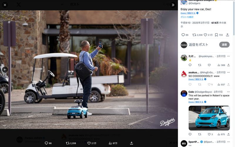 大谷選手がロバーツ監督に行なったいたずら(Xのスクリーンショット)
