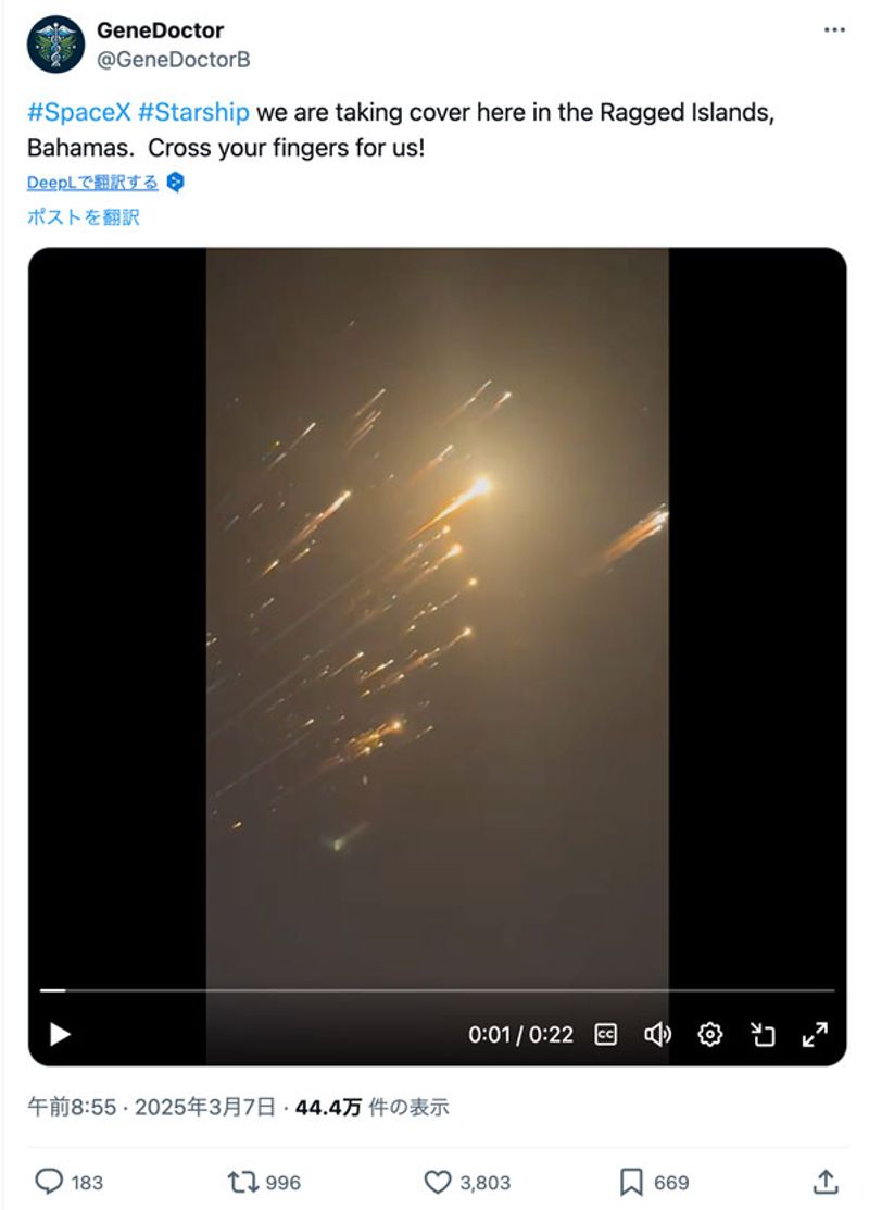 機体が分解し、空を明るい光の筋が横切る様子を映した動画。バハマで撮影(Xのスクリーンショット)