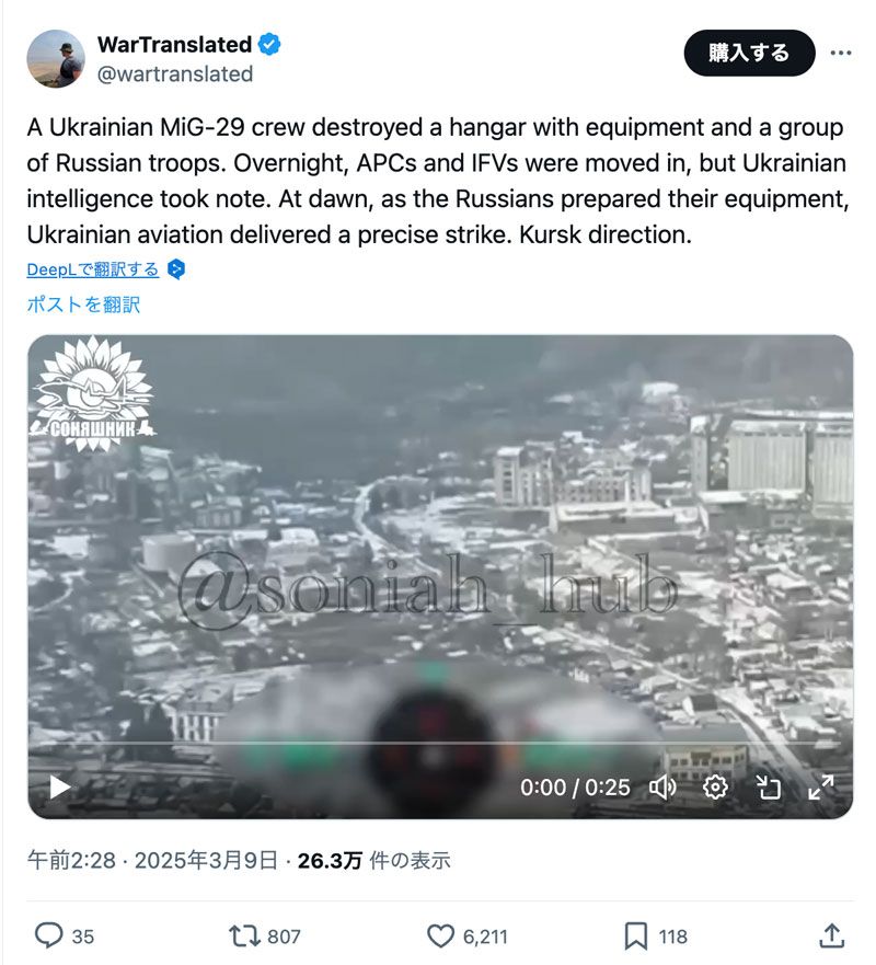 ウクライナ空軍はクルスク方面に出撃し、ロシア軍の反攻を支援する装甲車両が格納されていたとされる倉庫を空爆(Xのスクリーンショット)