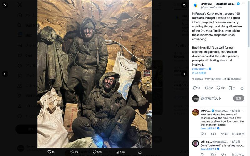 地下のガスパイプラインを通ってスジャへの潜入を図ったロシア軍部隊をウクライナ軍が撃退(Xのスクリーンショット)