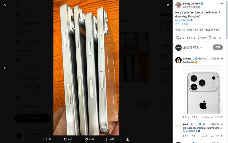 iPhone 17、iPhone 17 Air、iPhone 17 ProそしてiPhone 17 Pro Maxとされる機械加工されたブランクの写真(Xのスクリーンショット)