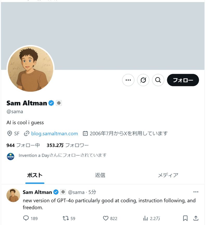 OpenAIのサム・アルトマンCEOのプロフィールも「ジブリ風」に(Xのスクリーンショット)