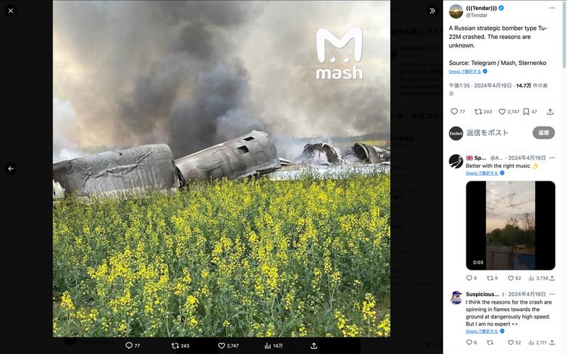 2024年4月にウクライナ軍の地対空ミサイルシステムで撃墜されたロシア軍のTu-22M爆撃機(Xのスクリーンショット)