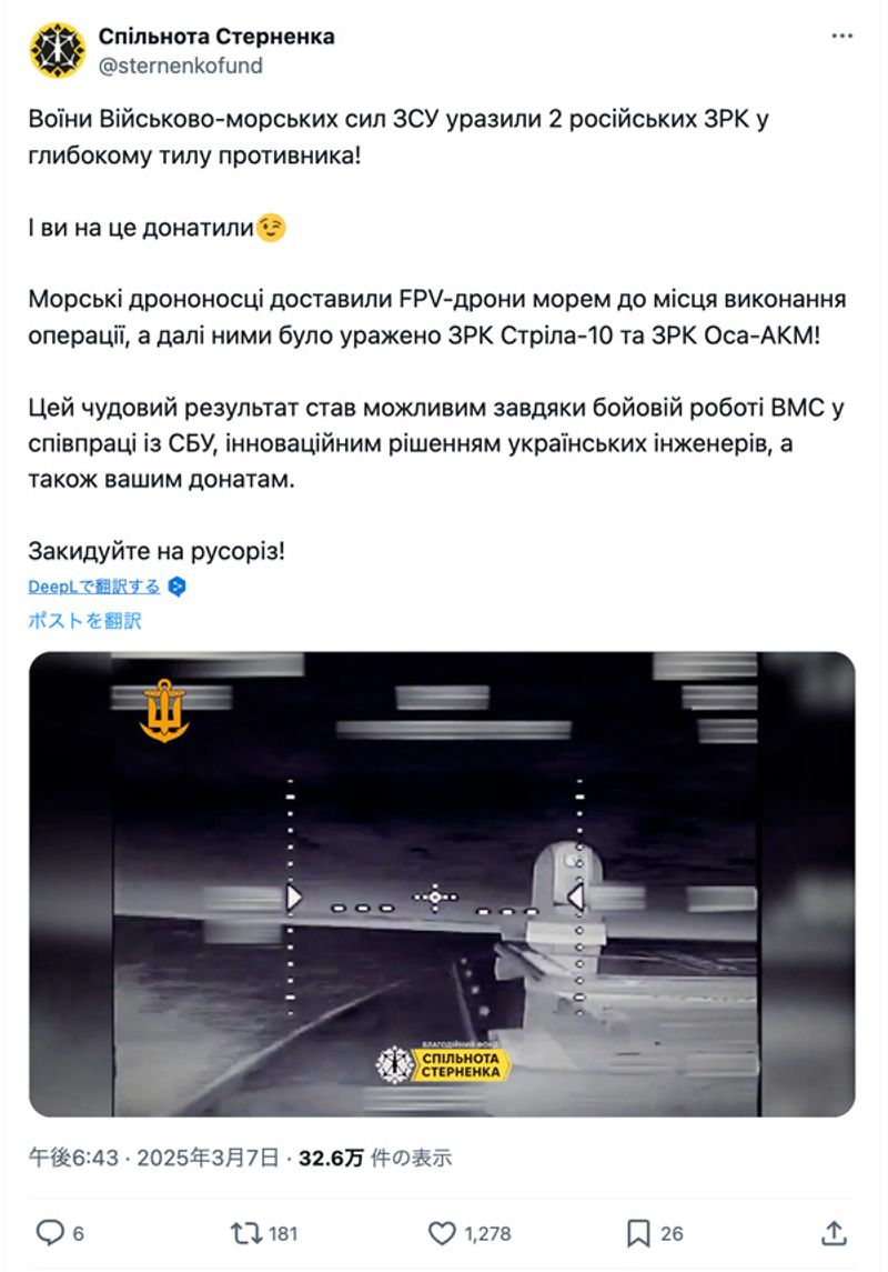 小型のFPV(一人称視点)攻撃ドローンも積載するウクライナのUSV。母船から発進したドローンは、レーダーや地対空ミサイルシステムといった沿岸目標を攻撃(Xのスクリーンショット)