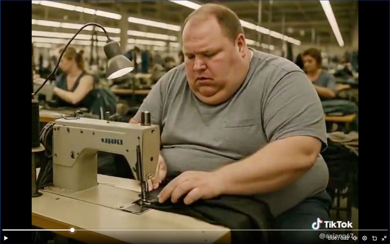 トランプが掲げる米国の製造業の復興を皮肉っている米国人が工場で働く様子を描いたミーム(Xのスクリーンショット)
