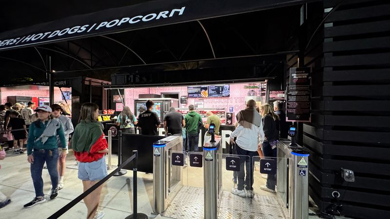 観客は入口でクレジットカードをかざし、あとは飲み物やフードを手に取って店を出るだけ。AIカメラとセンサーが誰が何を持ち出したかを瞬時に認識し、退出と同時に決済が完了する