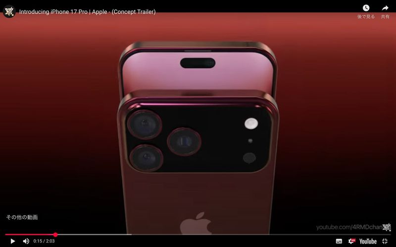 4RMDが紹介した次世代iPhone 17 Proとされるレンダリング画像(YouTubeのスクリーンショット)