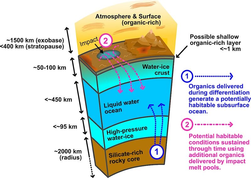 土星の衛星タイタン内部の層状構造を示した概略図。表面の厚さ1kmの有機物に富む層と厚さ50~100kmの氷殻の下に深さ450kmの内部海がある。1と2は今回の研究で検証した内部海への有機物の供給経路(Antonin Affholder et al 2025 Planet. Sci. J. 6 86)