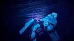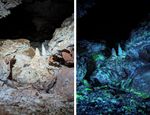 米サウスダコタ州の巨大洞窟ウインドケーブ内の調査区画の蛍光鉱物を白色光下で見た場合(左)と紫外線を照射した場合(右)(Joshua Sebree)