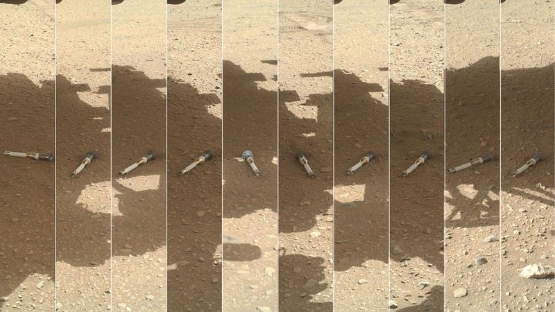 火星探査車パーセベランスによって火星地表に設置されたサンプルチューブ。当初の予定では、最大30~40本程度のチューブを回収し、2033年頃に地球へ持ち帰ることを目標としていたが……(C)NASA/JPL-Caltech/MSSS