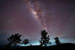 スリランカ・ラトナプラで、夜明け前の空を駆けるみずがめ座η流星群の流れ星と天の川。2024年5月5日撮影(Thilina Kaluthotage/NurPhoto via Getty Images)