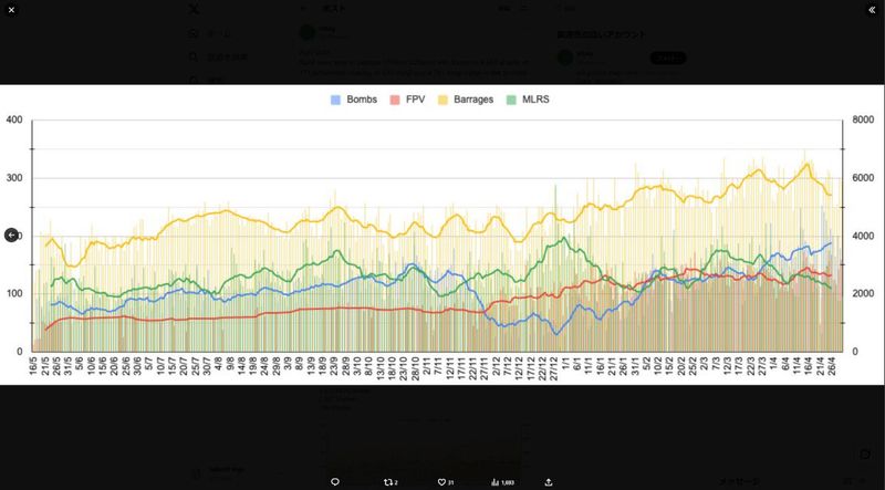 OSINT(オープンソース・インテリジェンス)アナリストのVitalyは、ウクライナに対して約175000回の攻撃を実施したと説明。このうち砲撃約9万回が含まれる可能性があるとした(Xのスクリーンショット)