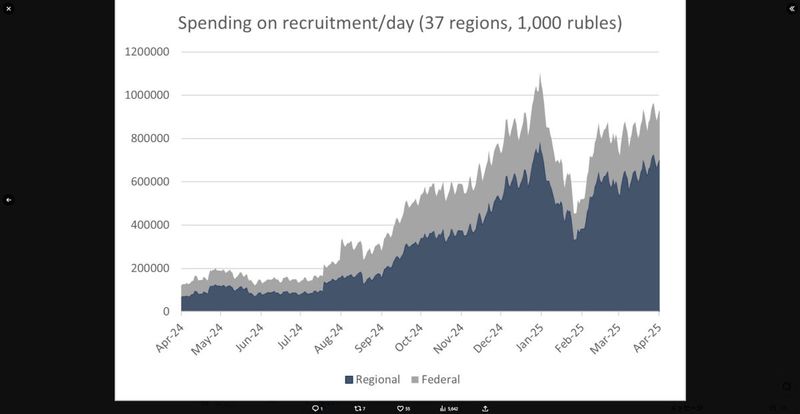 ドイツ国際安全保障研究所(SWP)で東欧・ユーラシア部門の副部長を務めるヤニス・クルーゲは、ボーナスへの支出総額は2025年4月現在で、1日あたり約20億ルーブル(約35億円)という。この状態が1年間続くと、GDPの0.4%に達すると説明(Xのスクリーンショット)