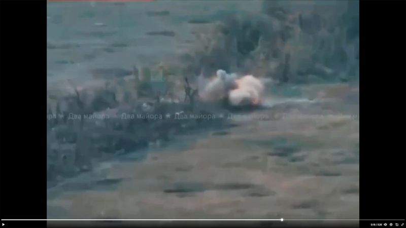 ソーシャルメディアで2日に共有された動画には、2輪のホバーボード2台を連結し、真ん中に対戦車地雷を載せた自爆型の無人ロボット数台が、ウクライナ軍の防御陣地とされる場所を爆破する様子が映っている(Xのスクリーンショット)