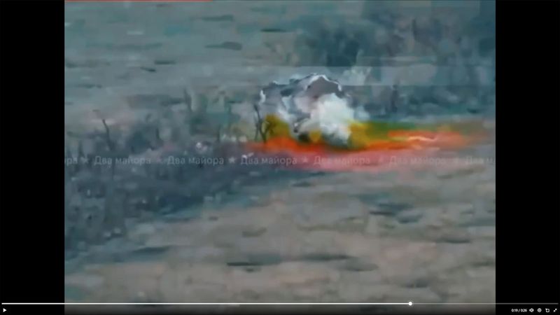 ソーシャルメディアで2日に共有された動画には、2輪のホバーボード2台を連結し、真ん中に対戦車地雷を載せた自爆型の無人ロボット数台が、ウクライナ軍の防御陣地とされる場所を爆破する様子が映っている(Xのスクリーンショット)