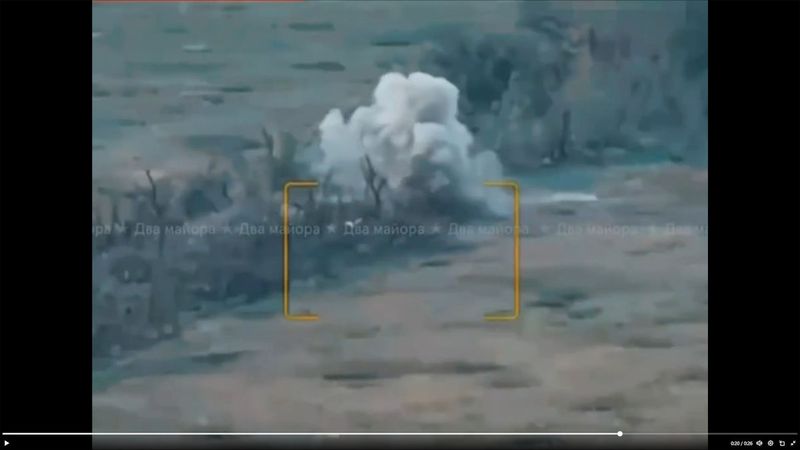 ソーシャルメディアで2日に共有された動画には、2輪のホバーボード2台を連結し、真ん中に対戦車地雷を載せた自爆型の無人ロボット数台が、ウクライナ軍の防御陣地とされる場所を爆破する様子が映っている(Xのスクリーンショット)