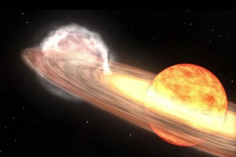 かんむり座T星と同様の赤色巨星と白色矮星の連星系の新星爆発を描いたアニメーション画像(NASA/Goddard Space Flight Center)